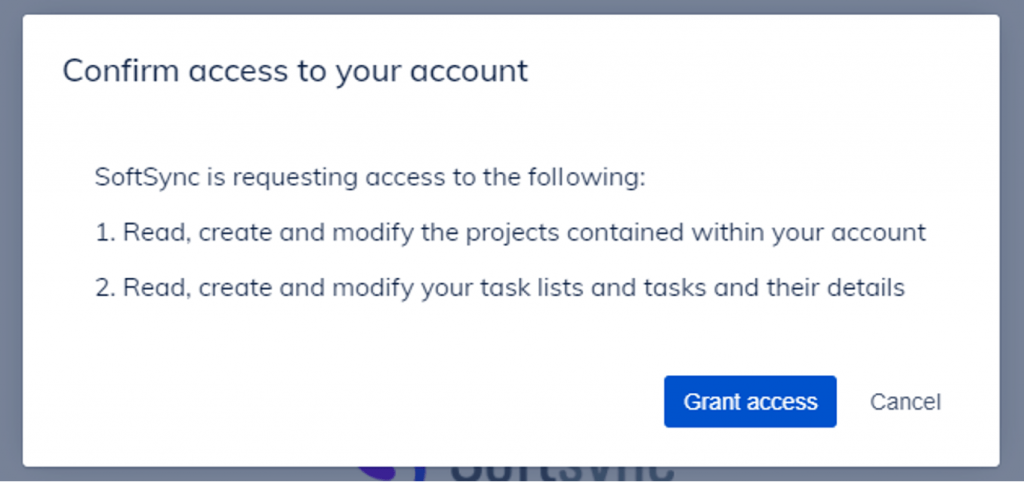 If there are no validation errors, the application will ask you to confirm access to your account. The access needed includes reading projects and reading/modifying your tasks and their details. If you agree with these, please click ‘Grant access’. If you disagree, SoftSync will not work.