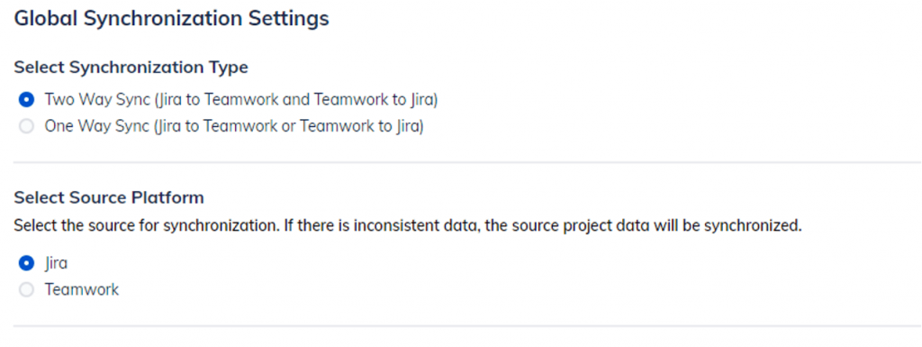 Source Platform – If you choose Two Way Sync, you should decide which application will be the main source for synchronization if there are inconsistencies in data in Teamwork or Jira.
