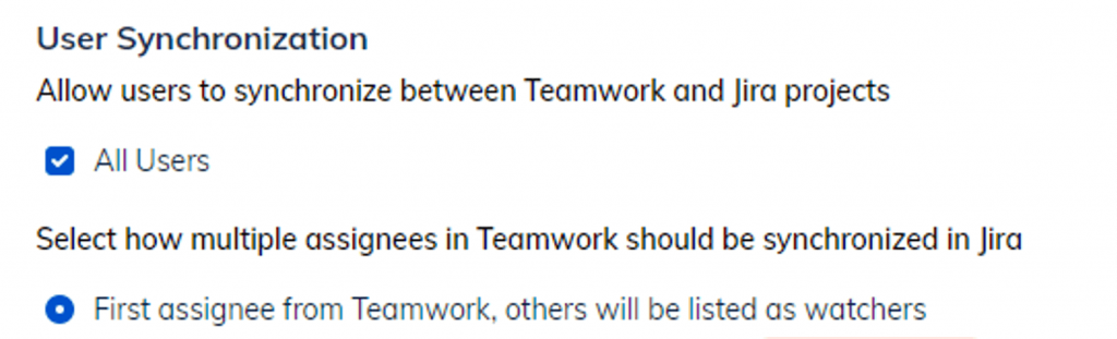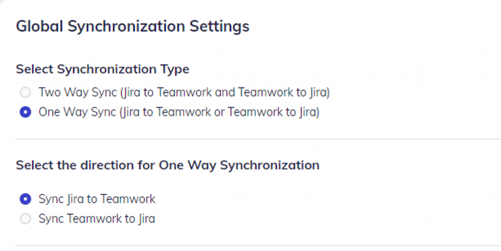 Direction for One Way Synchronization – If you choose One Way Sync, you should decide which will be the synchronization source. The default is “Sync Jira to Teamwork”.