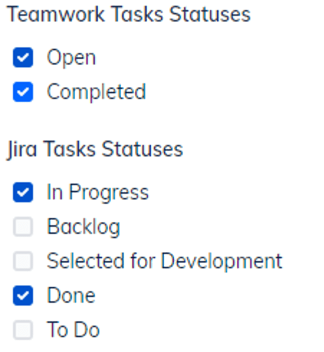 Task Statuses synchronization – In this setting, you can decide which statuses to synchronize in Teamwork and Jira. While Jira has custom statuses, Teamwork has a fixed list of statuses. To correctly synchronize statuses between Jira and Teamwork, you will need to indicate the Task Statuses you wish to synchronize.