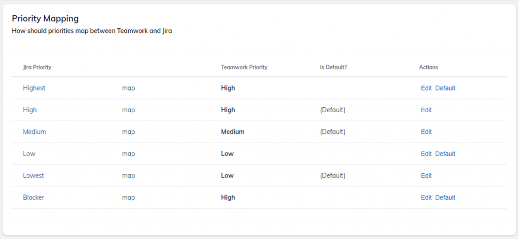While Jira has custom priorities, Teamwork has a fixed list of priorities. To correctly synchronize priorities between Jira and Teamwork, you will need to define the mapping between Teamwork and Jira.