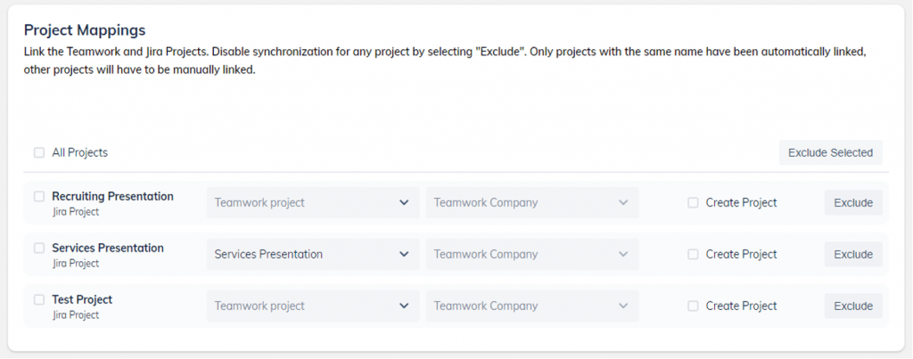 You can also exclude projects you don’t wish to synchronize. Simply click the “Exclude” button. You can remove projects in bulk by selecting multiple projects using the checkbox and clicking ‘Exclude Selected’.
