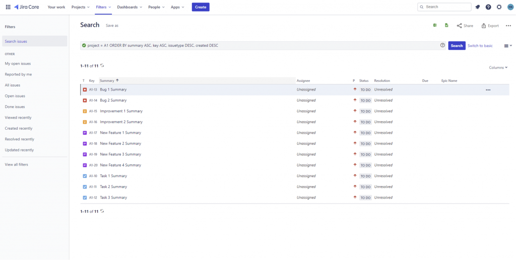The naming convention used is “Missing Epic – %IssueType%”. For instance, all bugs that don’t belong to an Epic will be moved to a task list “Missing Epic” in Teamwork.