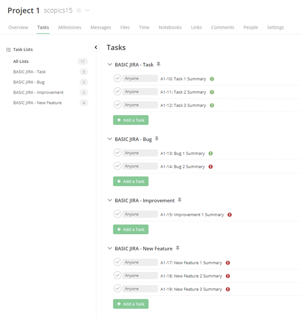 However, if the Epic for an issue type does not exist in your Jira project, Teamwork will have a custom task list created with all the tasks from Jira without Epics. Each issue type with at least one task in Jira will trigger a custom task list on Teamwork, named under the Jira ticket type, with the bugs or tasks under it.