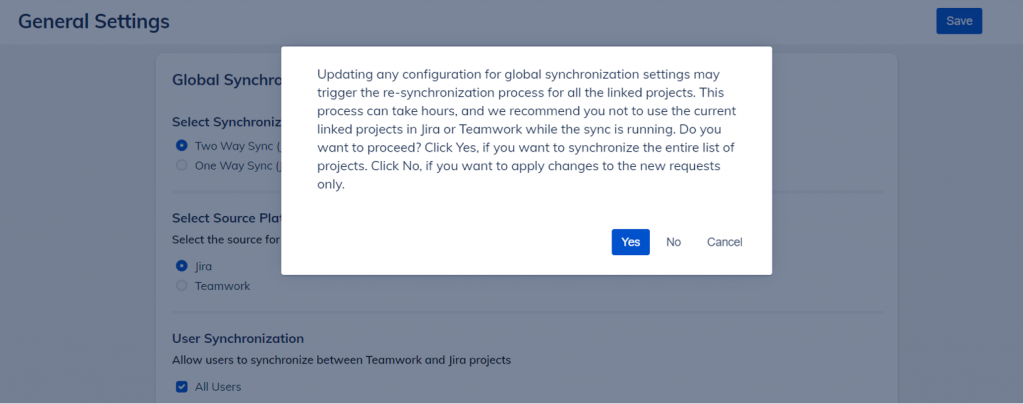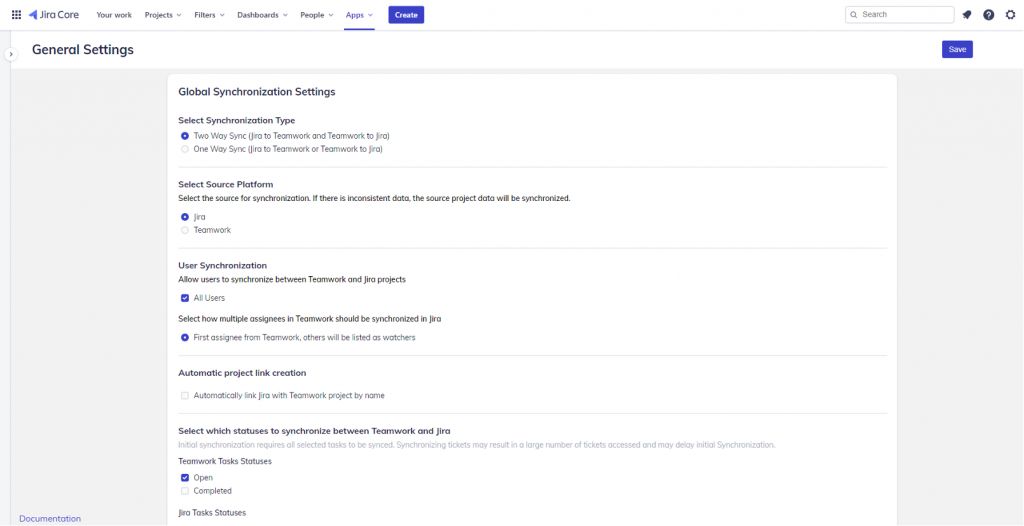 SoftSync’s general settings help you configure how to synchronize data between Jira and Teamwork. These settings include: