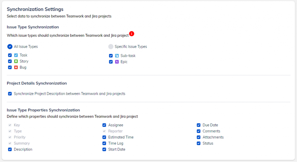 Issue Type – In this setting, you can sync all issue types or only selected issue types. In Teamwork, you cannot customize the Issue type. Teamwork only supports task lists, tasks, and sub-tasks. In Jira, you can customize the Issue type. You can set up which types you want to sync.