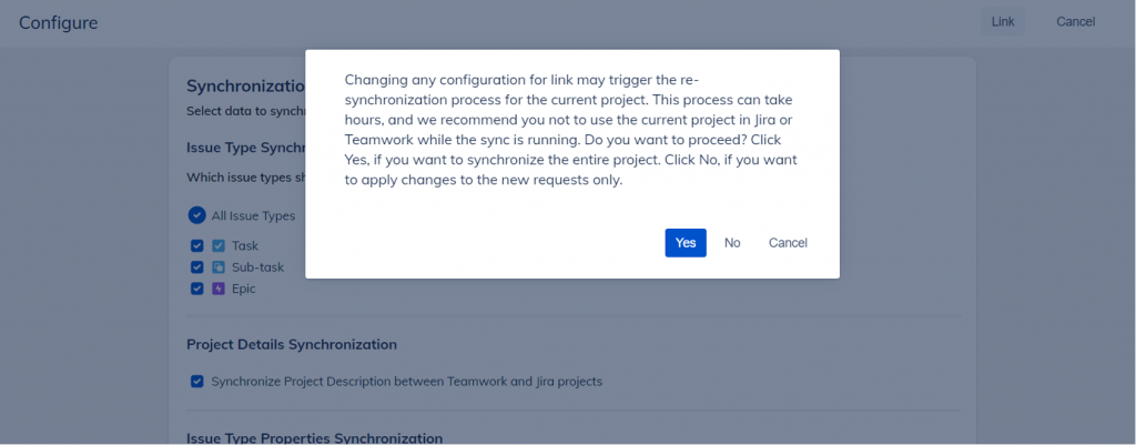 You can manually link an additional project at any time. Simply click on the Link action from the Unlinked projects list. You’ll see the same settings as you would during initial synchronization. Here’s what you’ll need to do:
