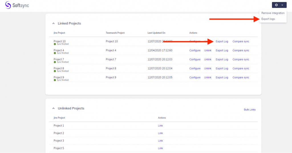 You can track the activity for each project at any given time by using the feature Export Logs under the Linked Projects. You can also click on the top right corner settings menu and export logs for all projects. SoftSync will allow you to download and save log files in the CSV format.